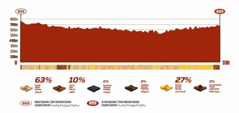 Il 90% della tappa si correrà su piste di sabbia di cui poco meno di un terzo sulle dune, il restante 10% su terra compatta