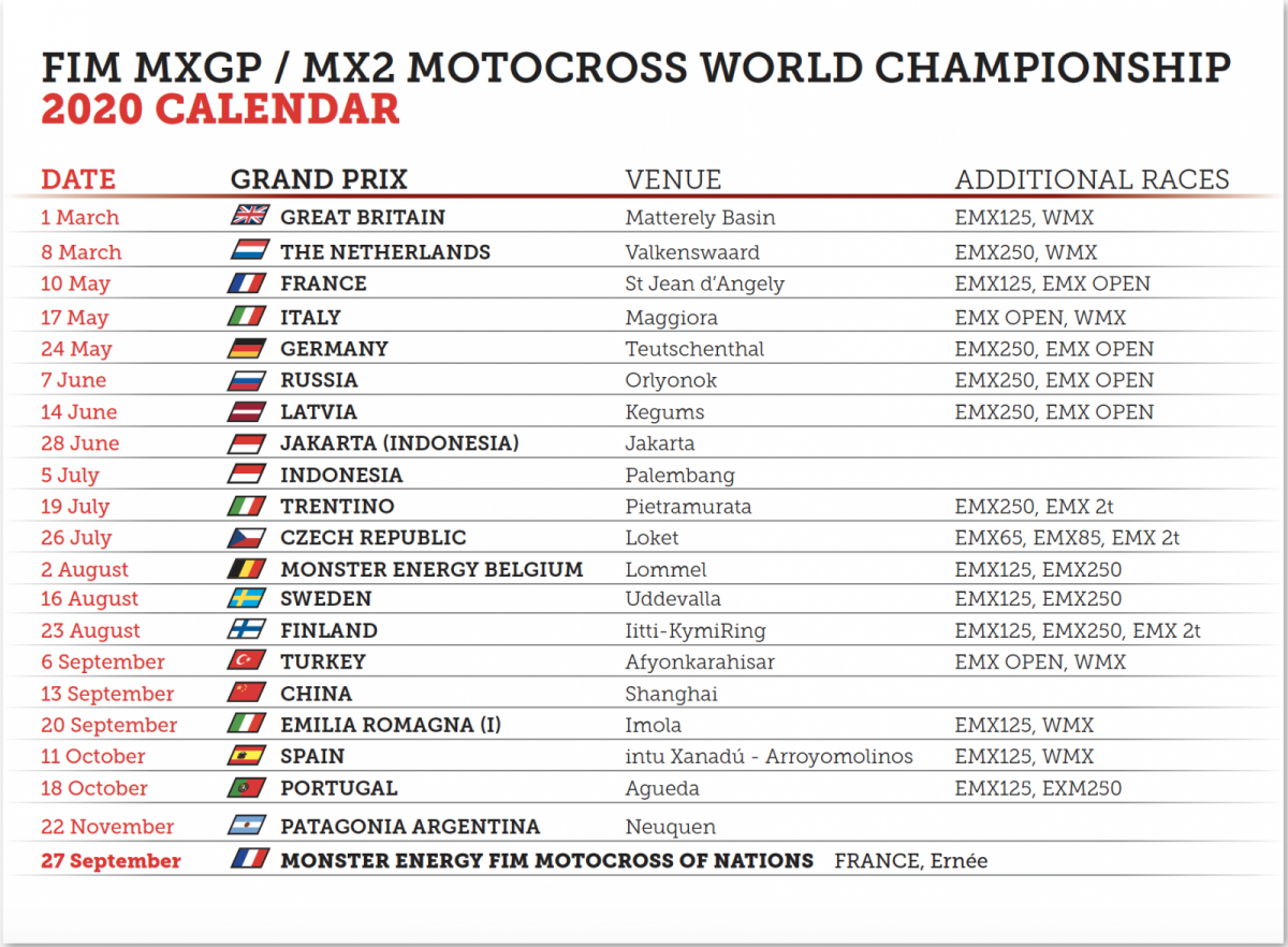 Questo è il calendario MXGP 2020 che quindi riprenderà il 10 di Maggio dalla Francia, virus permettendo…