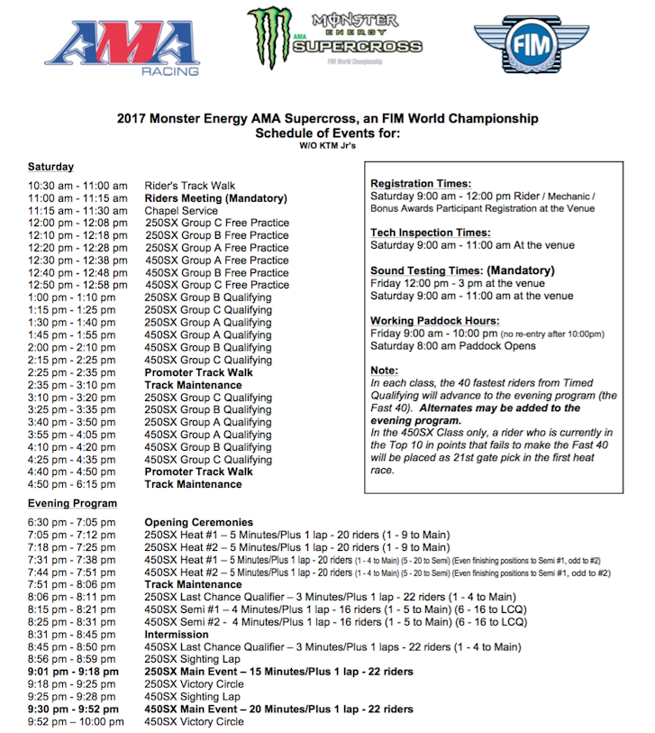 Qui di seguito il programma di Anaheim 1, prima prova della stagione 2017 fissata al 7 Gennaio all’Angel Stadium di Anaheim.