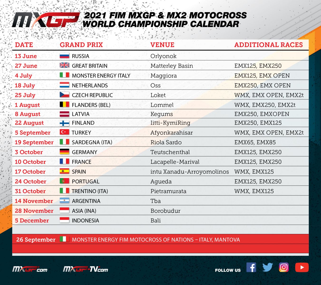 Il MXGP of Latvia di Kegums, previsto per il 10 e 11 Luglio , viene spostato al 7 e 8 Agosto, è cancellato il MXGP di Svezia che si dsarebbe dovuto correre ad Uddevalla ma tornerà a calendario nel 2022.