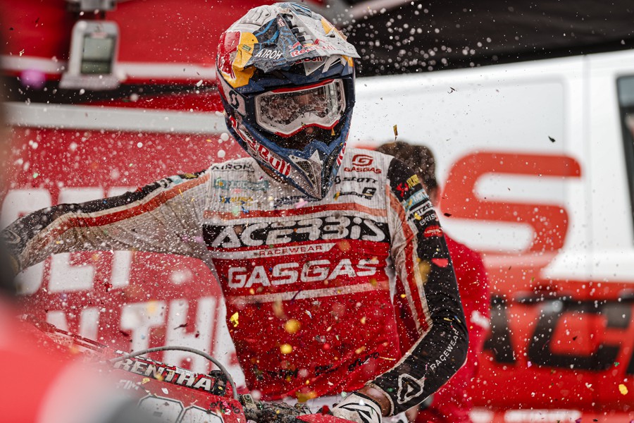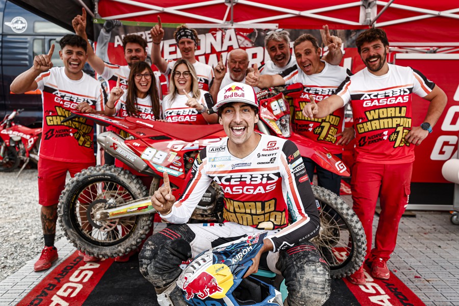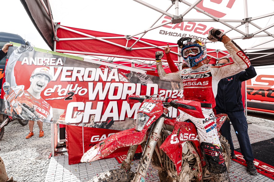 Ce l’ha fatta! Cogliendo l’alloro con una gara d’anticipo, l’asso GASGAS Factory Racing Andrea Verona ha conquistato il titolo mondiale FIM Enduro2 dominando entrambe le giornate del GP del Galles. Avendo vinto tutte le giornate fin qui disputate tranne una in cui è arrivato secondo, Andrea ha corso una stagione quasi perfetta che gli è valsa il settimo titolo mondiale in carriera.