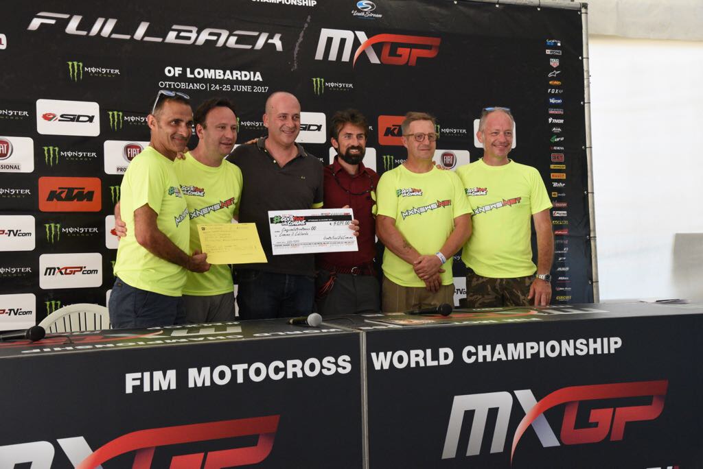 L’assegno simbolico, numerato con i riferimenti dei piloti che hanno supportato l’iniziativa, con numero di CC simbolico 222-1200 (perchè la maglia di Tony Cairoli è stata venduta a € 1200!!!) è stato consegnato sabato, in sala stampa ad Ottobiano, da Giancarlo Ricciotti, Roberto Rossi e Sandro Sant, in rappresentanza di tutta la #GenteFuoriDalComune, da Daniele Rizzi in rappresentanza di MXGP, a Gianni Fiastrelli, Assessore ai Lavori Pubblici del Comune di Caldarola ed a Massimiliano Vecchioni (appassionato di MX di Caldarola che ha fatto da tramite).