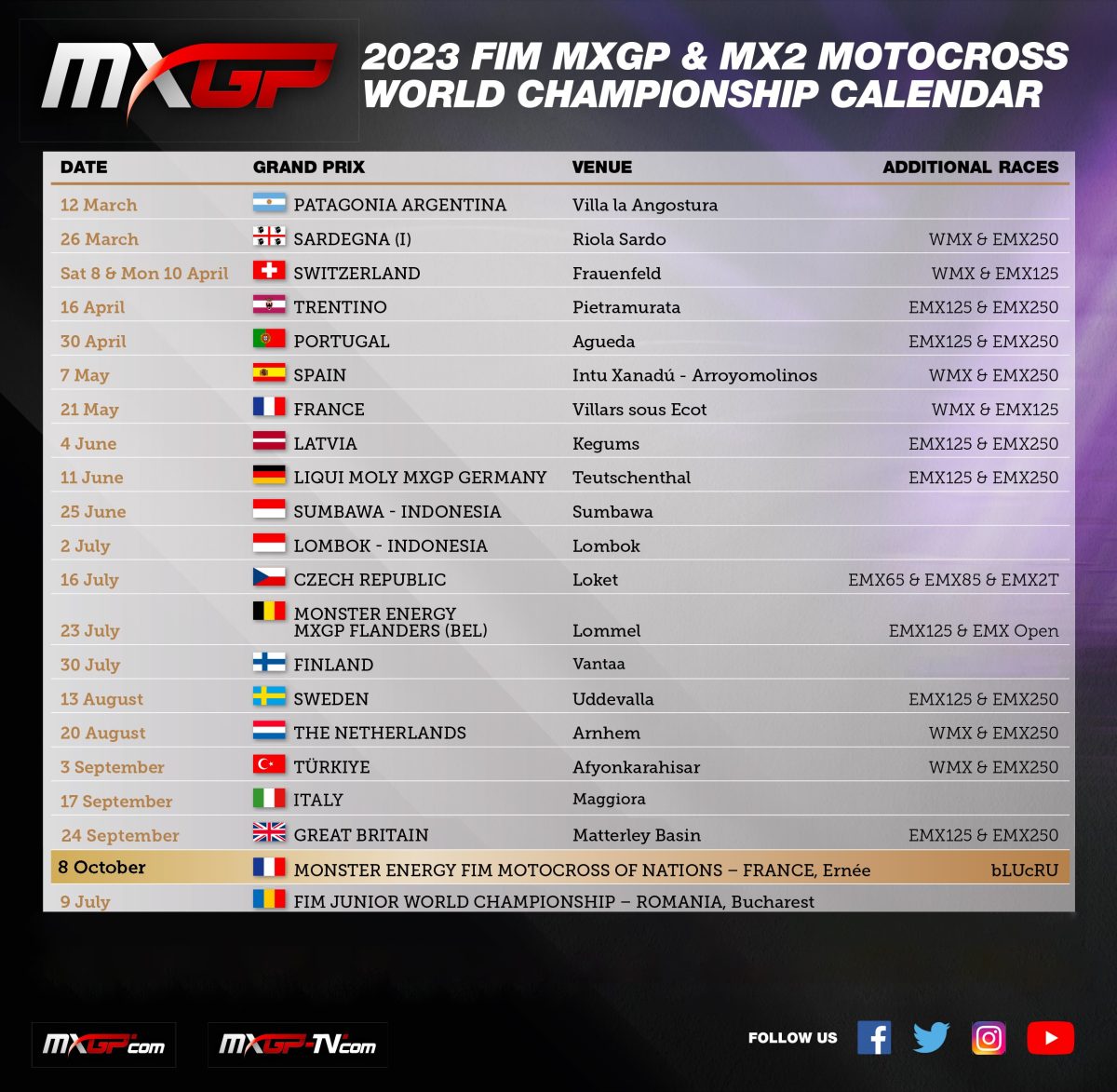 L’altra variazione riguarda il cambio di data del MXGP of Great Britain di Matterley Basin che viene anticipato di una settimana, quindi al weekend del 23 e 24 Settembre. Sui pratoni di Matterley Basin ci saranno anche EMX250 ed EMX125.