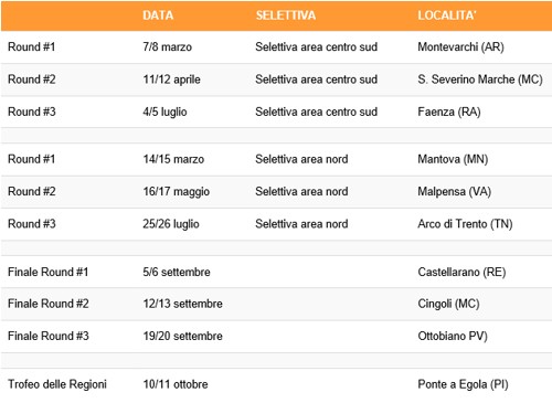 - Introduzione delle selettive con la suddivisione del territorio in due aree, nord e centro/sud. Le selettive saranno 3 (per ciascuna delle due aree) e daranno un punteggio (ridotto) valido per l’assegnazione del titolo. Le finali saranno previste in 3 gare (con punteggio pieno) e saranno ammessi i migliori 40 (20 per area) per ciascuna classe.