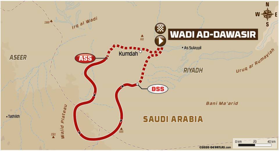 La tappa di oggi prevede la partenza e l’arrivo a Wadi Ad-Dawasir dopo aver percorso 227 Km di trasferimento e 403 Km di speciale su un terreno composto per il 78% di sabbia e un 10% di dune che hanno messo un po’ tutti in difficoltà.