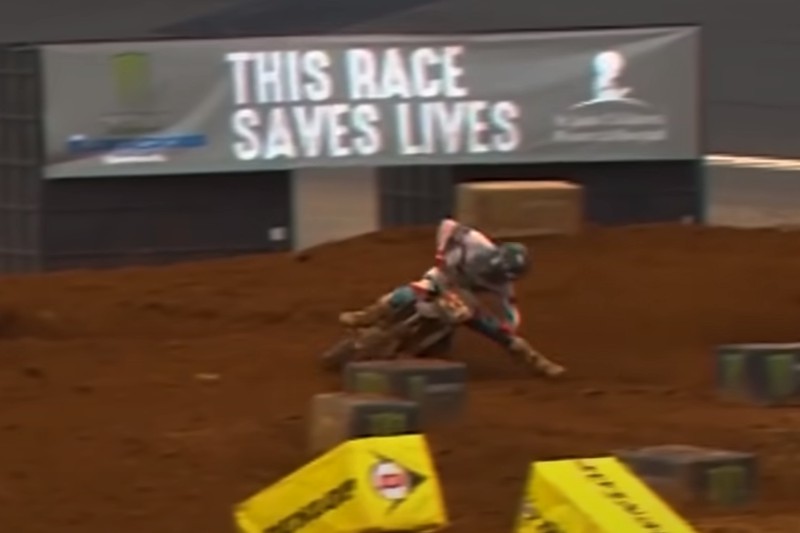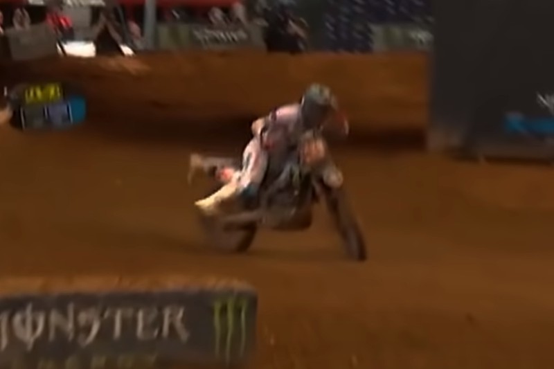 Sempre ad Atlanta, Tomac ha preso un’altra imbarcata paurosa ma è rimasto in piedi. Anche questa immagine è di pessima qualità ma ci aiuta a capire. Proprio da Atlanta, dove Tomac era arrivato con 6 vittorie di file, il pilota della Yamaha ha evitato ogni tipo di guaio e contatto con gli altri piloti, amministrando e accontentandosi di guadagnare punti importantissimi per la classifica.