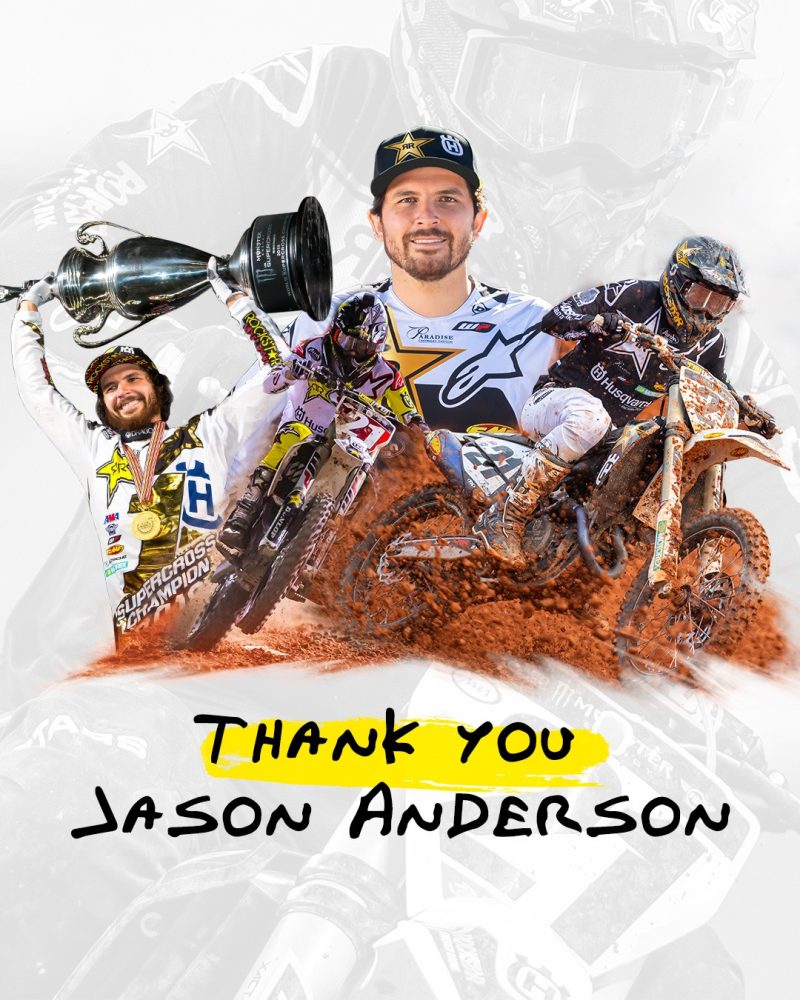 Husqvarna Motorcycles vuole esprimere un sentito ringraziamento a Jason Anderson per il suo impegno, il duro lavoro e i risultati raggiunti negli ultimi sette anni. Il rapporto lungo e costellato di successi tra il pilota americano e Rockstar Energy Husqvarna Factory Racing volge ora al termine.