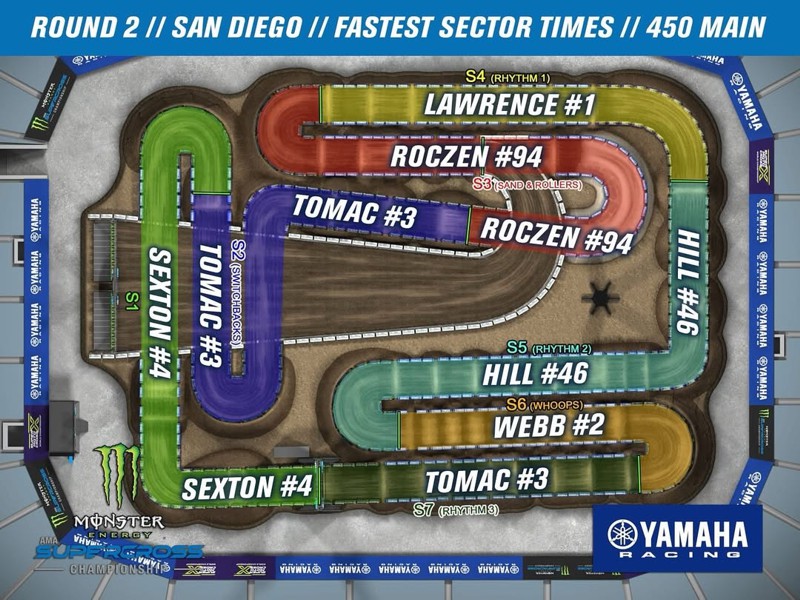 In un tratto di pista in particolare, la velocità di Tomac e Lawrence era davvero elevata, ma in questo tratto, il pilota della Yamaha ne aveva un po’ di più ed allungava, Lawrence riusciva a guadagnare qualcosa dopo la curva sulla sabbia.
