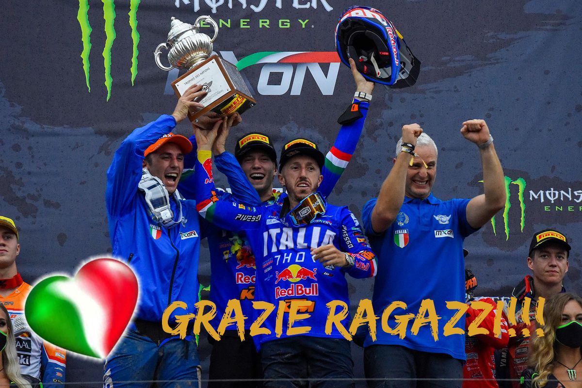 Mattia Guadagnini: “Una vittoria incredibile. Esordire al Nazioni con un successo è meraviglioso. Credo di aver corso bene nonostante alcuni errori. Sono state gare difficili ma abbiamo mantenuto i nervi saldi e abbiamo portato a casa un Trofeo ambito da tutti i piloti del Motocross mondiale. Non potevo aspettarmi giornata migliore, sono davvero emozionato e soddisfatto”.