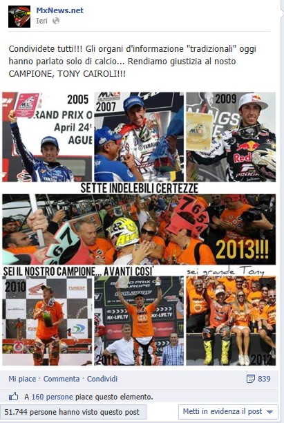 Se avete Facebook, continuate a martellare, continuare a condividere, che il nome del Campione del Mondo MX1 2013, Antonio Cairoli, arrivi nelle case di tutti gli Italiani!