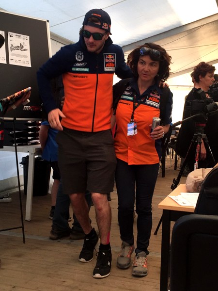 Non è invece passato inosservato l’ingresso in sala stampa dell’olandese della KTM alla conferenza post gara: Jeffrey saltellava sulla gamba destra e non appoggiava il piede sinistro.