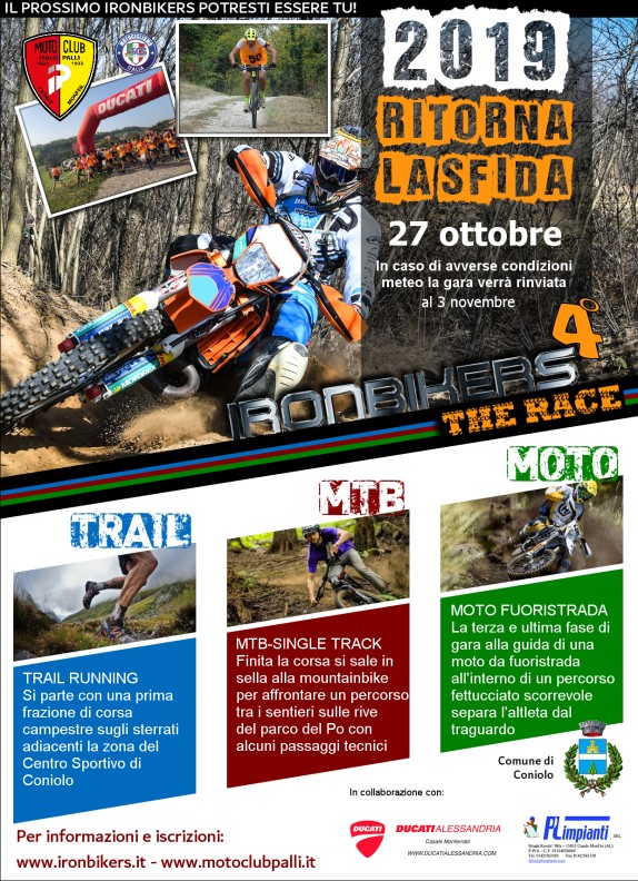 Domenica 27 ottobre 2019 a Coniolo Monferrato (AL), si svolgerà la quarta Edizione della “Ironbikers The Race”, l’unica manifestazione che vede impegnati i concorrenti nelle tre discipline della corsa, della mtb e del fuoristrada motociclistico.