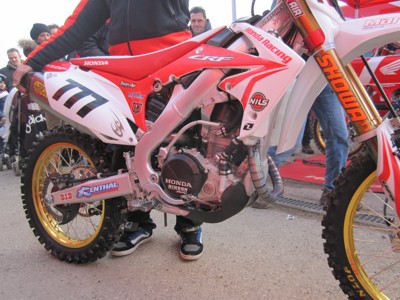 Come ci aveva anticipato Paolo Martin a metà del 2011, Honda torna al Mondiale Motocross con i prototipi, quelle uniche e stupende moto create per i piloti ufficiali, da cui poi derivano, comunque sempre molto lontanamente, le moto di serie di 2/3 anni dopo. Già a prima vista questa moto, di serie non ha nulla. Nemmeno lontana parente di quella in vendita, nemmeno nel colore dei carter. Tanti particolari che fanno ricordare di essere davanti ad una Factory di quelle al 100% o forse ancora di più, visto che le moto di Hirata e di Leuret, presenti allo Starcross, ufficiale 100%, non sembravano nemmeno dello stesso produttore, tante erano le differenze. Insomma un progetto tutto nuovo. Forcellone arrotondato (sembra leggermente più lungo), radiatori diversi, pedane come opere d’arte, cassa filtro tutta diversa, ma sicuramente racchiuso in quei carter dal colore strano ci sono le cose che non sono date a sapere, così come nel cilindro, motore che pulsa attraverso un capolavoro dato dal collettore di scarico che fa un giro stranissimo: uscendo leggermente sulla destra del cilindro, piega verso il basso, passa sotto al telaio (comunque in una zona molto avanzata), risale dall’altro lato, e passa a destra del cilindro dove è presente una valvola (non c’è più la camera di ricircolo). Il collettore (abbiamo carpito la parolina “Mugen”), si infila infine dietro al cilindro per sbucare sulla parte destra e confluire nel silenziatore Arrow.