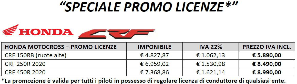 • LISTINO CRF MOTOCROSS PROMO LICENZE – il listino riservato a tutti i piloti in possesso di licenza di conduttore valida (di qualsiasi Ente) al momento della richiesta della moto presso il punto vendita.*