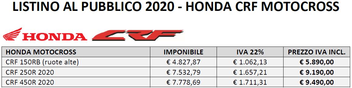 • LISTINO CRF MOTOCROSS – uniformato a tutto Europa