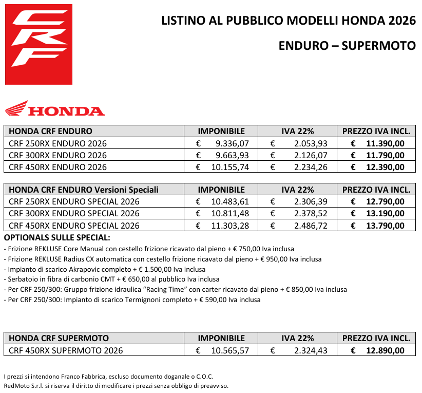 Ecco la gamma Honda-RedMoto Enduro 2026 che sarà composta per questa nuova stagione da tre cilindrate: 250RX, 300RX e 450RX sia nella versione standard che nella fantastica -e come di consueto super accessoriata – versione SPECIAL, tutte con omologazione Euro 5 Plus. I nuovi modelli 2026 replicano fedelmente le Honda RedMoto che hanno vinto la Six Days di enduro con Samuele Bernardini e Manolo Morettini. Le caratteristiche tecniche restano sostanzialmente invariate, a conferma dell’affidabilità e delle prestazioni che hanno decretato il successo della gamma.