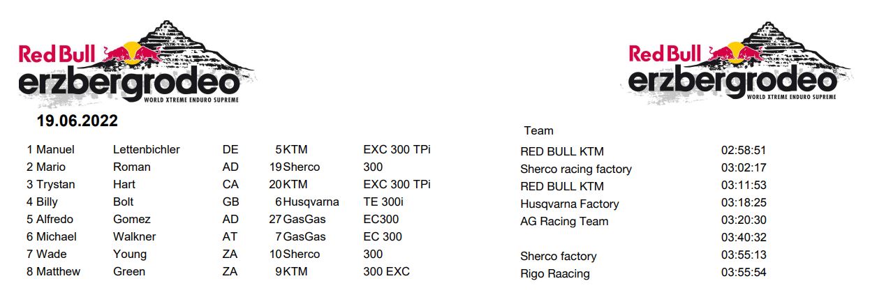 Lettenbichler ha così raggiunto, esausto ma felice, il famoso traguardo in vetta al Gigante di Ferro in poco meno di tre ore, dopo aver superato alcune delle più impegnative sezioni dell’intero calendario mondiale FIM Hard Enduro. Questa vittoria è storica anche per un altro motivo: è la prima volta in cui padre e figlio conquistano la vittoria in questa incredibile gara: Andreas, il papà di “Mani”, aveva infatti vinto l’edizione 2015.