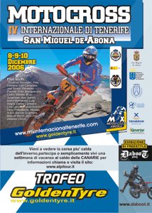 Si svolgerà il 9 e 10 dicembre la 4° edizione del Motocross Internazionale di Tenerife trofeo Goldentyre. Johnatan Barragan cercherà h confermato che scenderàin pista per difendere il titolo conquistato lo scorso ano ma non avrà vita facile visto che una bella schiera di piloti blasonati ha già confermato la presenza, compreso Ivan Cervantes. Inoltre Brian Jorgensen disputerà la sua ultima gara. Non mancherà il Freestyle con la Daboot in rampa.