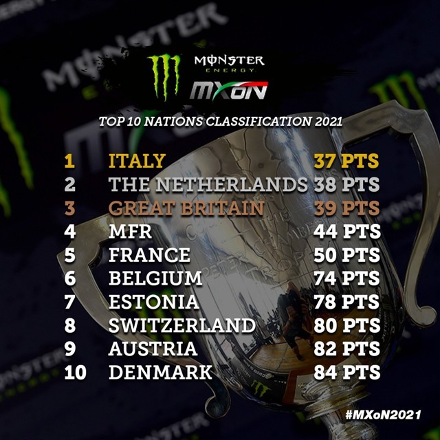 MXoN Race 2 (MX2+Open): Jeffrey Herlings parte al comando, nelle prima posizioni Guillod, Van Donink, ma anche Mattia Guadagnini ed Alessandro Lupino entrambi partiti benissimo. Herlings scappa via, Guillod si porta al secondo posto, Hofer è terzo inseguito da Guadagnini, Van Donink è quinto, sesto Lupino, poi Jacobi, Petrov e Gifting. Problemi per Vialle che resta appiedato e deve ritirarsi, Guadagnini forza, Hofer sbaglia e Mattia si porta al terzo posto, ma purtroppo scivola e perde qualche posizione. A metà manche Herlings è solo al comando, Guillod è secondo poi Hofer, Van Donink, Jacobi, Lupino e Guadagnini. Piccolo errore per Lupino che scivola ma viene scavalcato solo da Guadagnini. Herlings vince con un gran distacco su Guillod, terzo è Hofer, quarto Van Donink, quinto è Jacobi, sesto Guadagnini, settimo Lupino, poi Gifting, Jasikonis, Bobryshev. Uno sguardo alle squadre: l’Olanda piazza Van de Moosdijk 20°, Everts per il Belgio termina 13°, la Francia vede lo zero di Vialle e Boisrame 19°