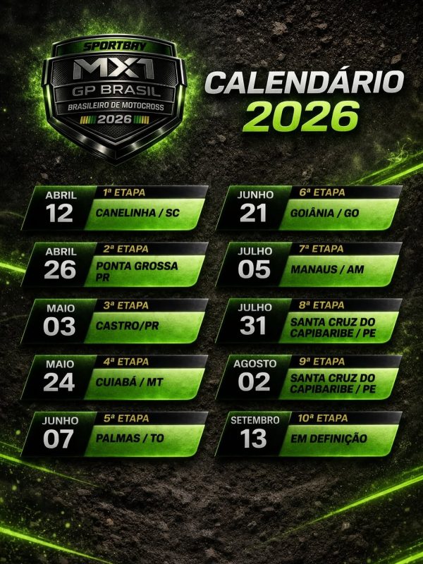 La prima tappa del Brasileiro de Motocross 2026 si svolgerà il 11 e 12 aprile a Canelinha, nello Stato di Santa Caterina, presso la storica Fazenda Silva Neto, un impianto che ha regalato momenti memorabili per il Motocross in Brasile ospitando anche un GP.