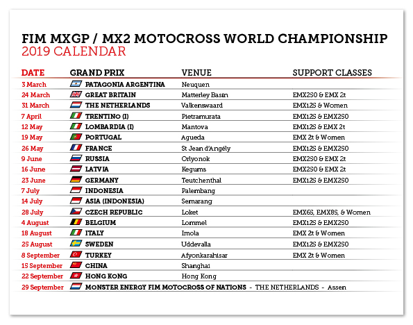 Youthstream comunica che che il quinto round del FIM Motocross World Championship 2019 previsto come MXGP della Cina a Shanghai è stato riprogrammato a causa delle avverse ed eccezionali condizioni meteorologiche che si sono verificate nella regione di Shanghai negli ultimi 4 mesi.