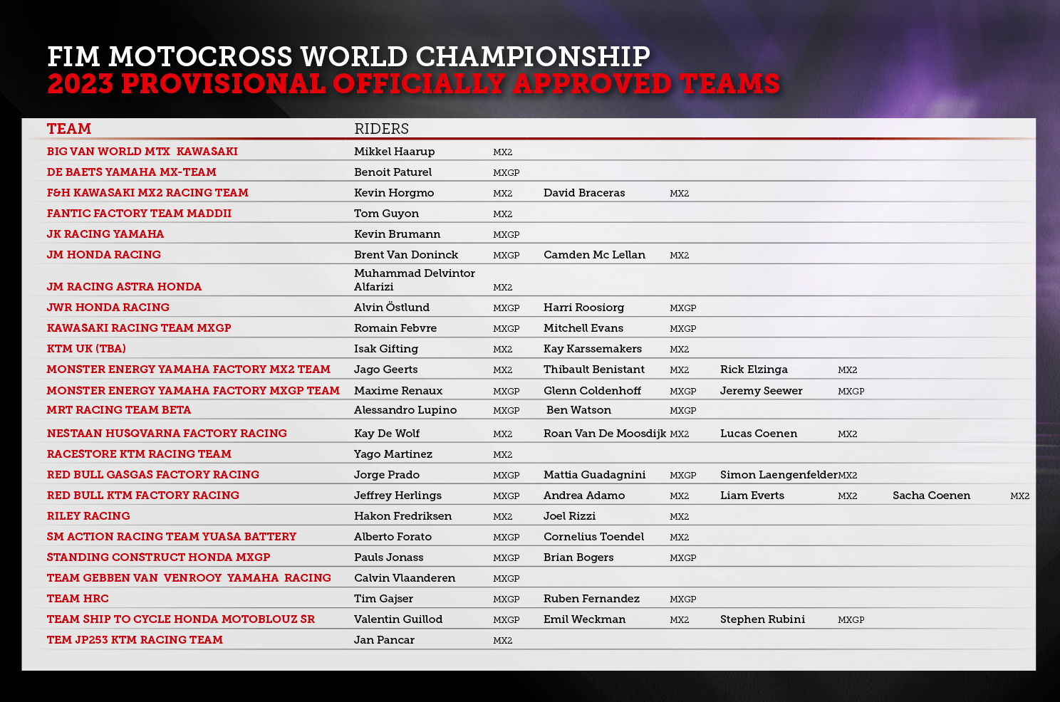 news MXGP 2023 Lista Team Provvisoria Sandro Sant — 23 Dicembre 2022 Condividi Infront Moto Racing comunica la lista provvisoria dei teams della MX2 e della MXGP 2023. Marzo si avvicina! Tags: MotocrossMX2MXGP CONDIVIDI SU: