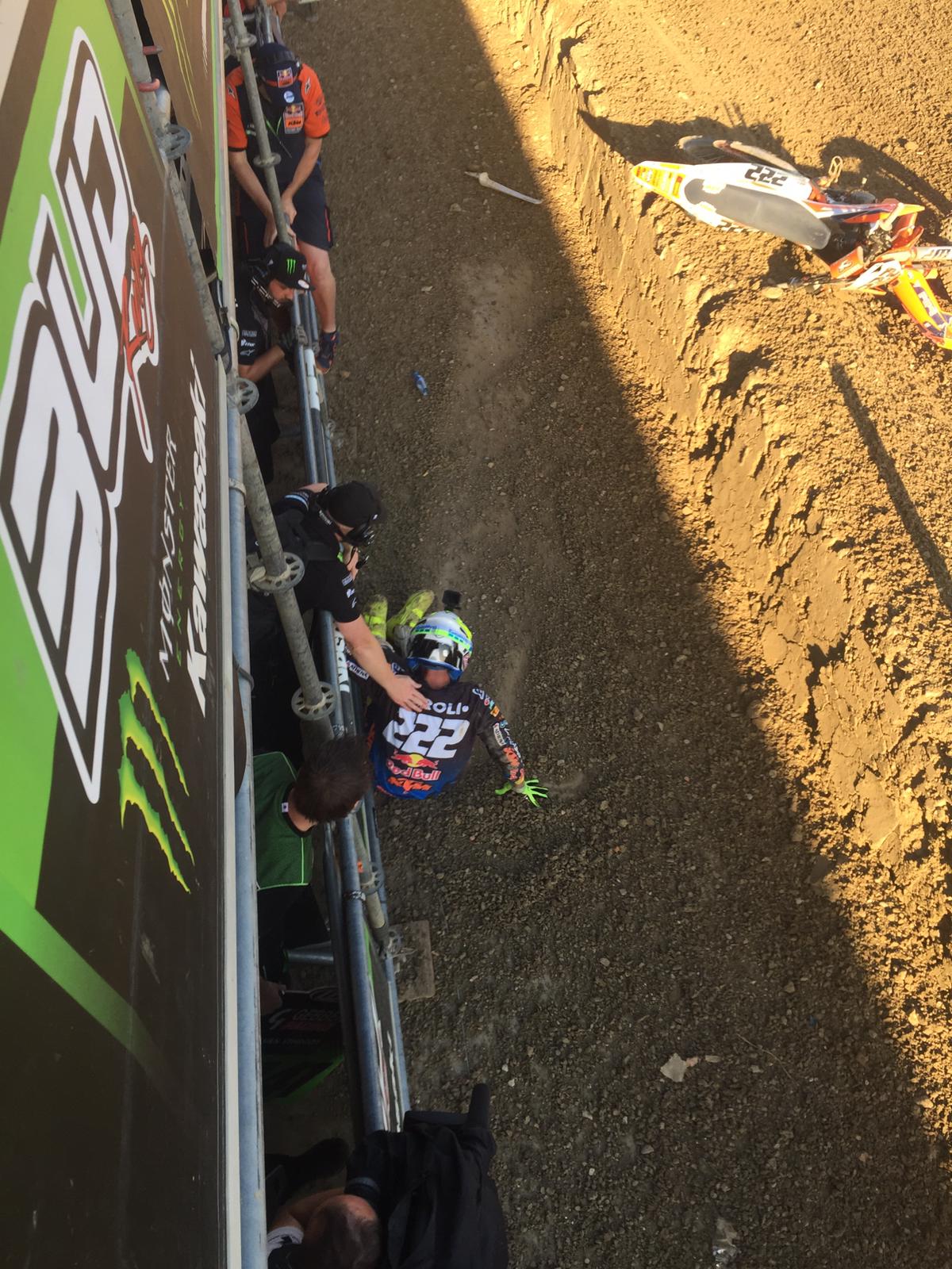 DOMENICA: Antonio Cairoli dopo aver effettuato il warm up decide di non prendere il via. La botta rimediata sbattendo sul cemento fa molto male ed in vista del MXoN è meglio riposare.