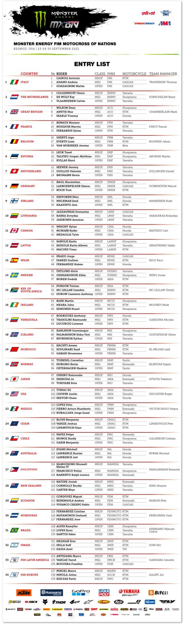 Il grande favorito è il Team USA che è quasi “costretto a vincere”: Eli Tomac e Chase Sexton sulla 450 con Justin Cooper sulla MX2, avranno il 101, 102, 103, quasi per un successo annunciato, ma come sappiamo, nel nostro sport, mai dare nulla per scontato. Agli americani brucia perché è dal 2011 che non vincono e le prendono sonoramente: quest’anno, in casa, schierano un tridente da paura con il chiaro obiettivo di stravincere e fare festa in casa, ma fino alla bandiera a scacchi e con la pressione che i piloti sentiranno, non si sa mai…