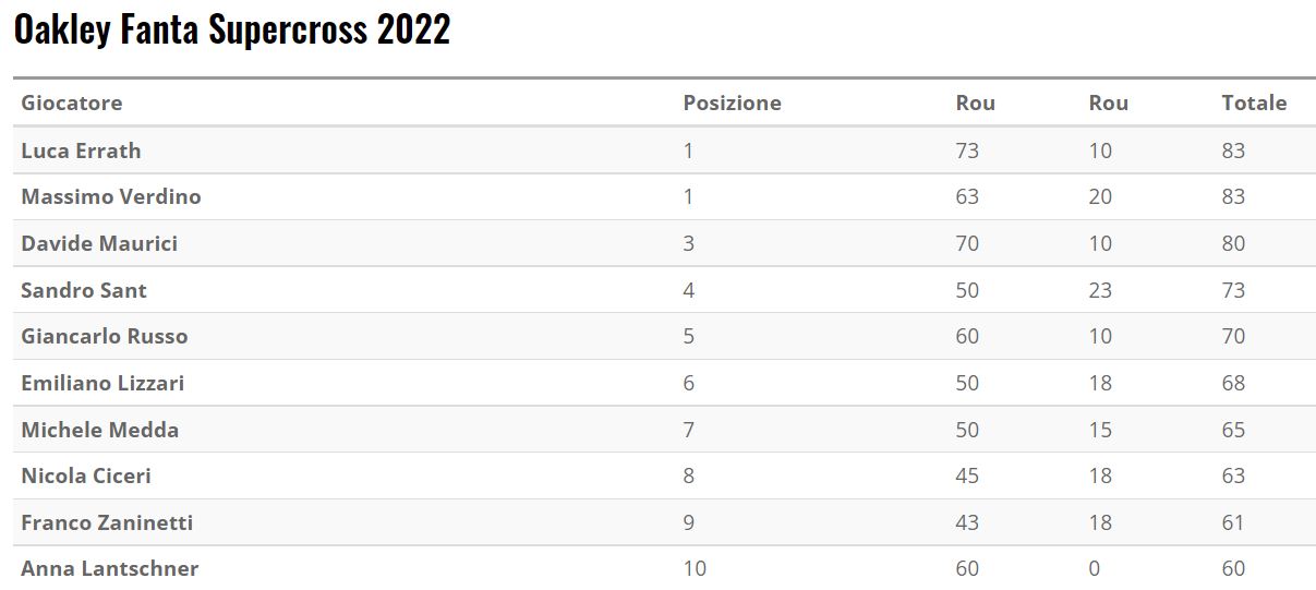 Questa settimana non era per niente facile azzeccare il podio: la vittoria di Jason Anderson è stata una sorpresa e pochissimi l’avevano inserito come vincitore (forse tre), ma non era facile nemmeno prevedere Plessinger e Barcia a podio con Webb e Roczen fuori dai top 5. Questa la classifica del Round 2.