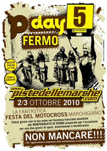 Il prossimo 2-3 ottobre 2010 torna il motocross day organizzato dagli amici marchigiani, denominato PISTEDELLEMARCHE-DAY (per gli amici P-DAY) arrivata alla sua quinta edizione. La festa si volgerà presso l’impianto internazionale “Monterosato” di Fermo (FM) che ha recentemente ospitato l’ultima prova del Campionato del Mondo di Motocross.