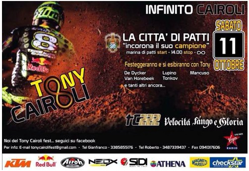 Alle 19:00 in piazzetta Garibaldi, si aprirà l’asta per la vendita di caschi ed altro materiale donato dagli amici di Tony: sono attesi Ken De Dycker, Alessandro Lupino, Aleksandr Tonkov, Jeremy Van Horebeek, Antonio Mancuso, e tanti altri campioni, per festeggiare l’ottavo titolo mondiale e per rendere omaggio a papà Benedetto recentemente scomparso.