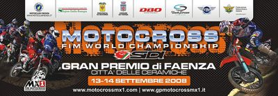 Arriva il secondo appuntamento motociclistico internazionale di questo 2008. Il 13 e 14 settembre si correrà il Sidi Gran Premio di Faenza Città delle Ceramiche, tappa conclusiva del mondiale motocross, che assegnerà i titoli delle due cilindrate MX1 (450cc) ed MX 2 (250cc).