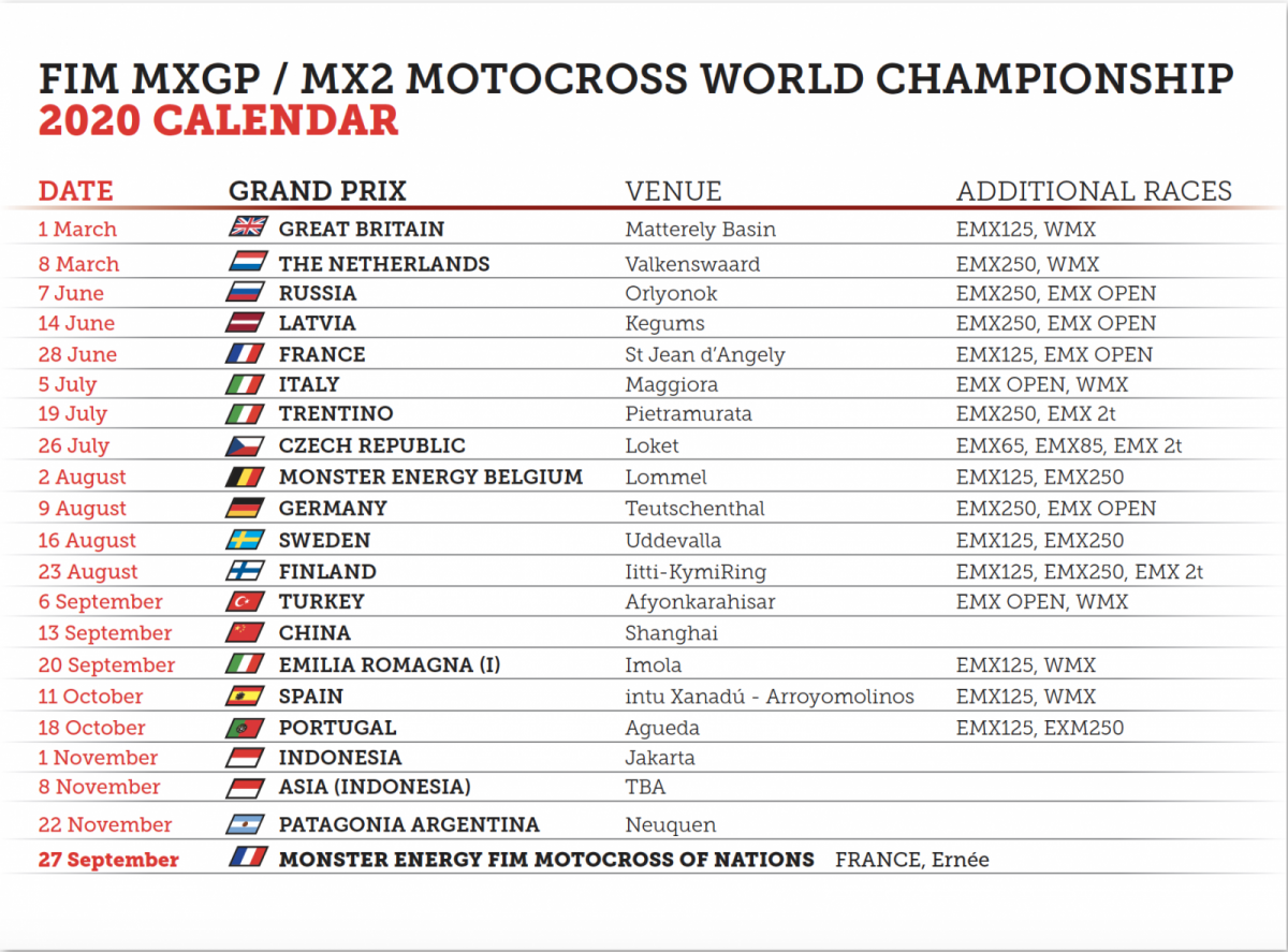 A questo punto, la MXGP si ferma fino a 7 Giugno 2020, quando è in programma la prima gara che non ha subito modifiche al calendario: si tratta del MXGP of Russia di Orlyonok.