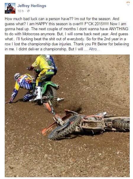 How much bad luck can a person have?? Im out for the season. And guess what? I am HAPPY this season is over!!! F*CK 2015!!!!! Now I am gonna heal up. The next couple of months I dont wanna have ANYTHING to do with Motocross anymore. But, I will come back next year. And guess what.. I’ll fucking beat the shit out of everybody. So for the 2nd year in a row I lost the championship due injuries. Thank you Pit Beirer for believing in me. I didnt deliver a championship, But I will in the future. Thanks to the rest of the team, and all my sponsors and partners. Sorry, I fighted as long as I could. But I think I had the devil with me the last 369 days !! Seems God hates me. Thanks to my parents and brother and Ruubs and everybody close to me for sticking behind me. Big thanks to my girl she always stayed behind me. I love you so much babe. Sorry for letting everyone down. I just got no words for this…
