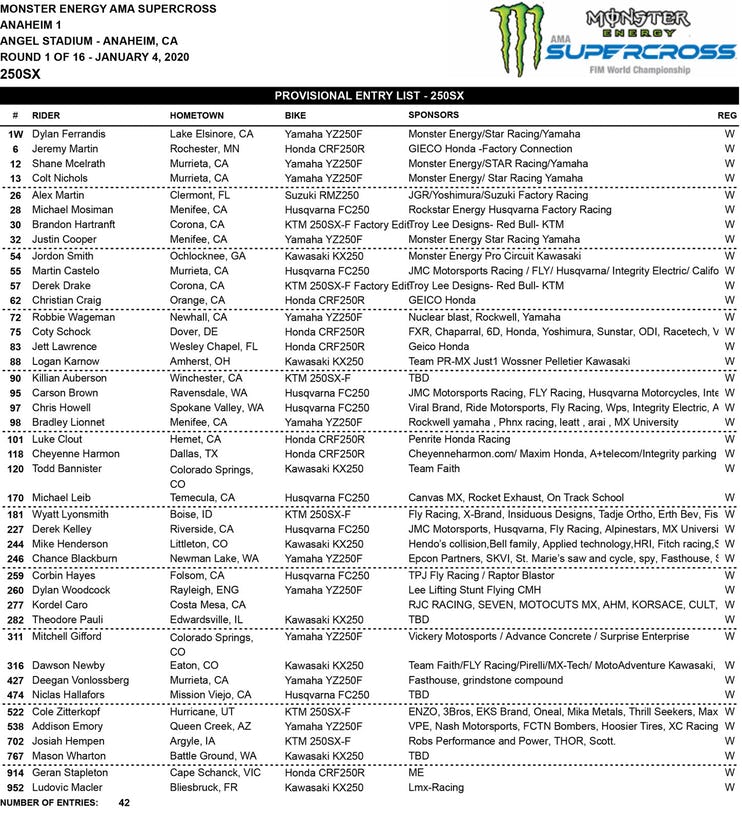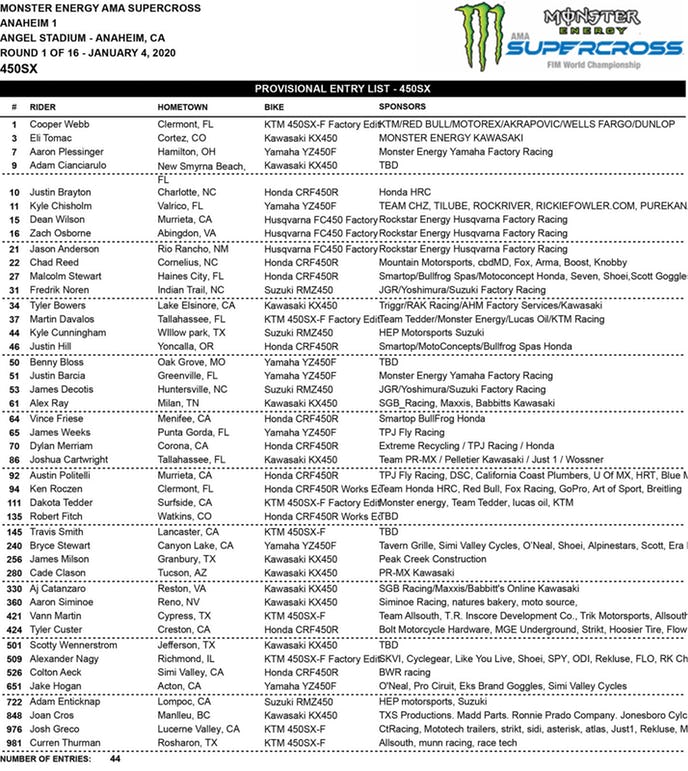 Non è la lista definitiva dei piloti che saranno al via della prova inaugurale del Supercross 2020, ma da l’idea di chi si schiererà dietro al cancello di partenza.