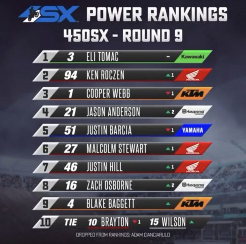 Eli Tomac resta in cima al gradimento degli addetti ai lavori, mentre Roczen supera nuovamente Webb che sarà in pista nonostante la botta subita ad Arlington. Salgono Anderson e Stewart, scompare Cianciarulo fermo per infortunio
