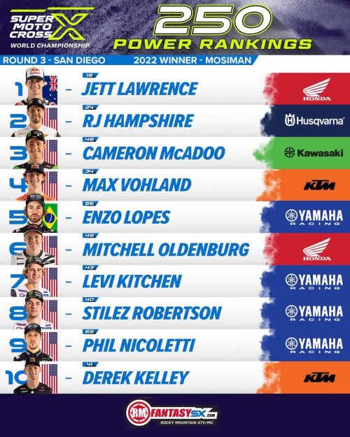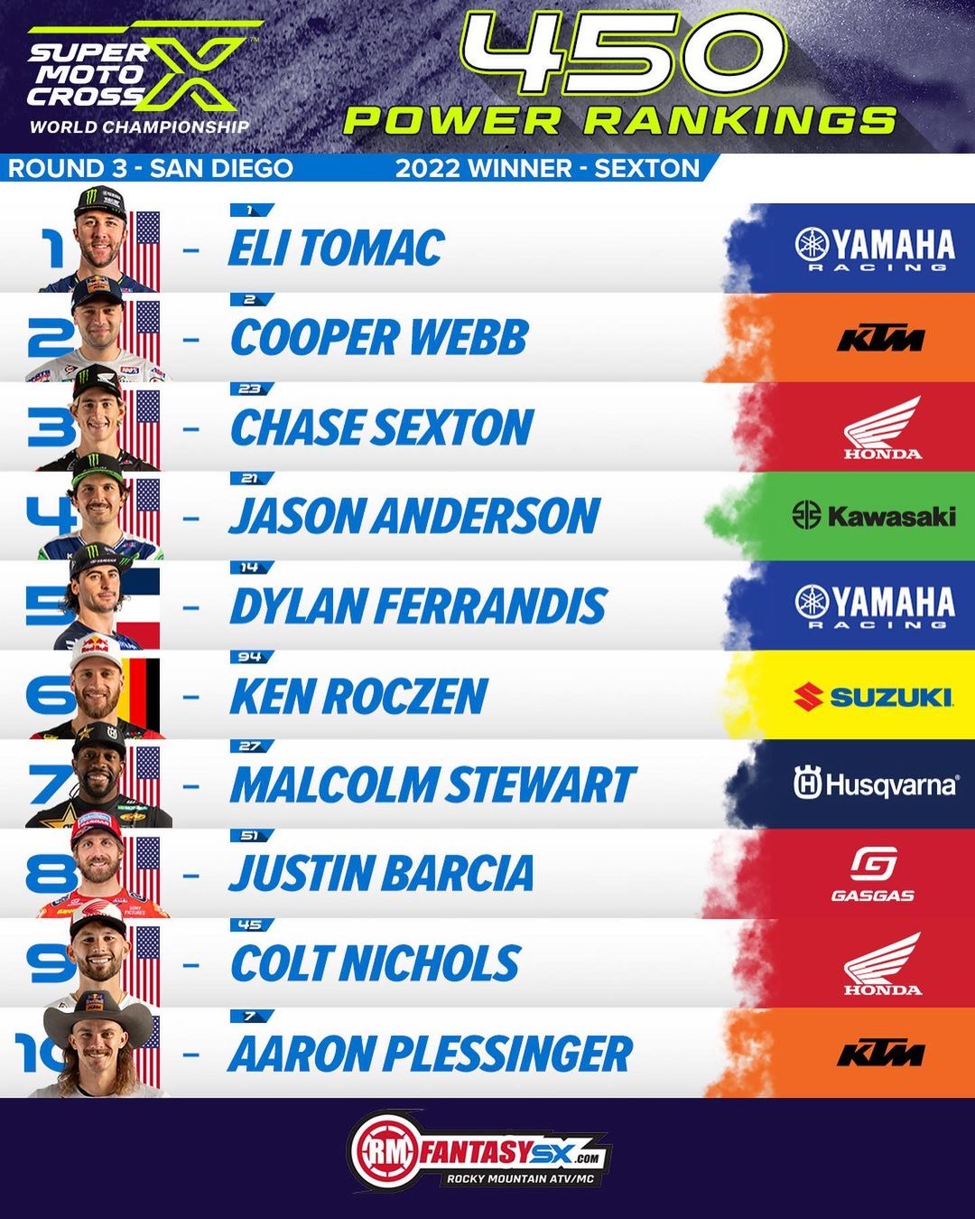 Ecco il Power Ranking per la prova di San Diego, la speciale classifica stilata dagli addetti al lavori del Supercross.