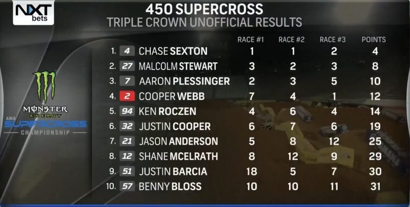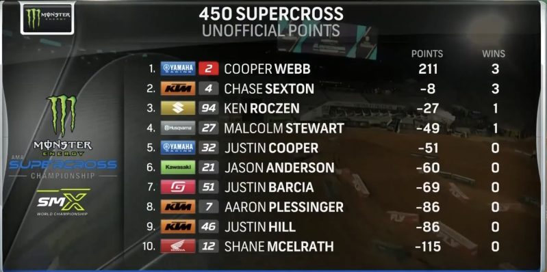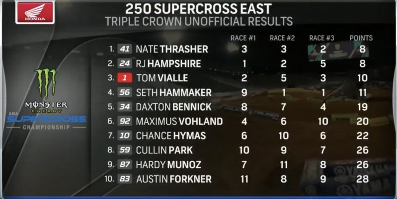 E’ un evento Triple Crown quindi tre manche per ogni classe, più corte e più movimentate, dove sbagliare la partenza significa mettersi nei guai. In pista oltre alla 450 anche i ragazzi della 250 East Region, che vede al comando Tom Vialle con un punto di vantaggio su Max Anstie, 11 su Hammaker e 12 su Hampshire.