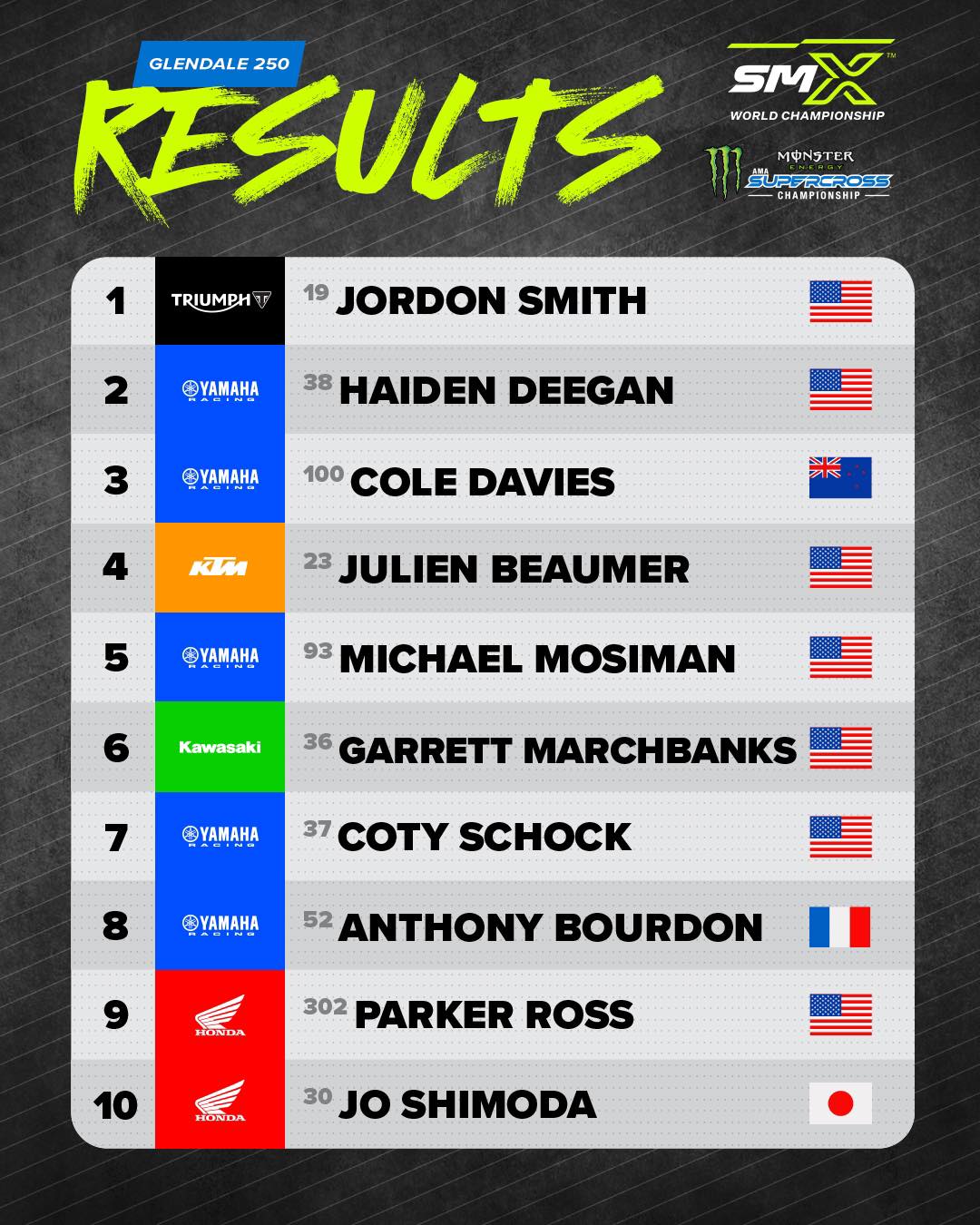 In 250 ci sarà da divertirsi, grazie alla rivalità che sta crescendo tra Haiden Deegan e Julien Beaumer. Deegan ne ha di più, probabilmente lo sa, ma sa anche di essere casinista e incline agli errori: su tre manche bisogna essere attenti ed il pilota della Yamaha sembra più attento ai proclami che a quanto combina in pista. Dall’altra parte il pilota della KTM, risponde che i giochini di Haiden non lo disturbano e cerca di essere consistente. Fatto sta che Beaumer ha la tabella rossa con 7 punti di vantaggio di Deegan, prima di una gara nella quale ogni errore costa caro. Riusciranno gli altri ad inserirsi nella diatriba? Jordon Smith sicuramente ci proverà, Jo Shimoda che sta stringendo i denti dovrà soffrire ancora, Cole Davies, con le manches più corte, potrebbe essere una bella sorpresa.