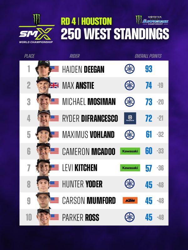 In 250 corre ancora la West Region con Haiden Deegan balzato al comando della classifica. Il pilota della Yamaha non è mai riuscito a partire bene e questa gara, richiede partenze a razzo.