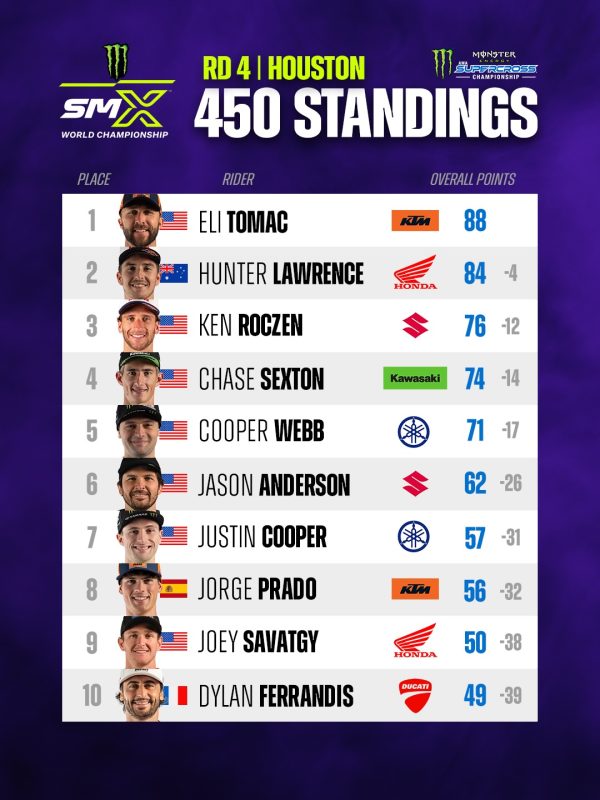 E’ ancora troppo presto per fare considerazioni ma è chiaro chi sono i piloti più veloci in pista: Eli Tomac e Chase Sexton, al momento hanno dimostrato qualcosa in più degli altri. Il primo è un rullo compressore, il secondo è semplicemente Sexton, con la sua velocità ed i suoi errori.