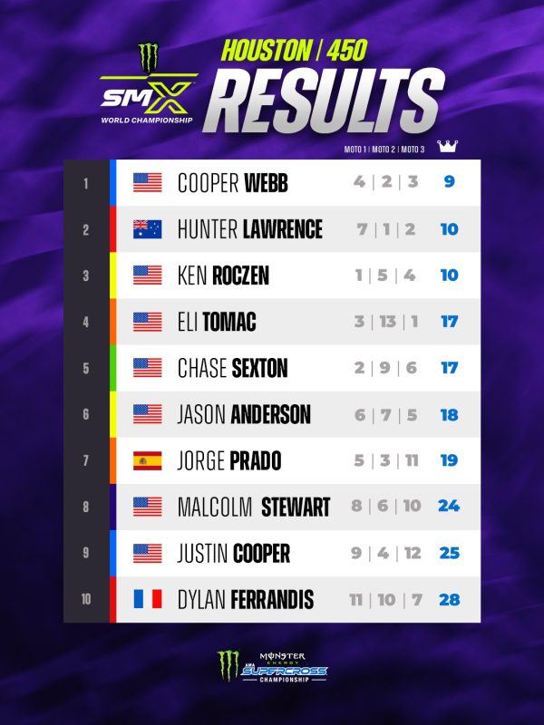 Le prove Triple Crown, nel corso della stagione saranno tre, Round 4 a Houston, Round 9 a Indianapolis, Round 14 a Cleveland e forniscono anche la classifica per un campionato nel campionato: si corre per essere il Monster Energy Supercross Triple Crown Champion!
