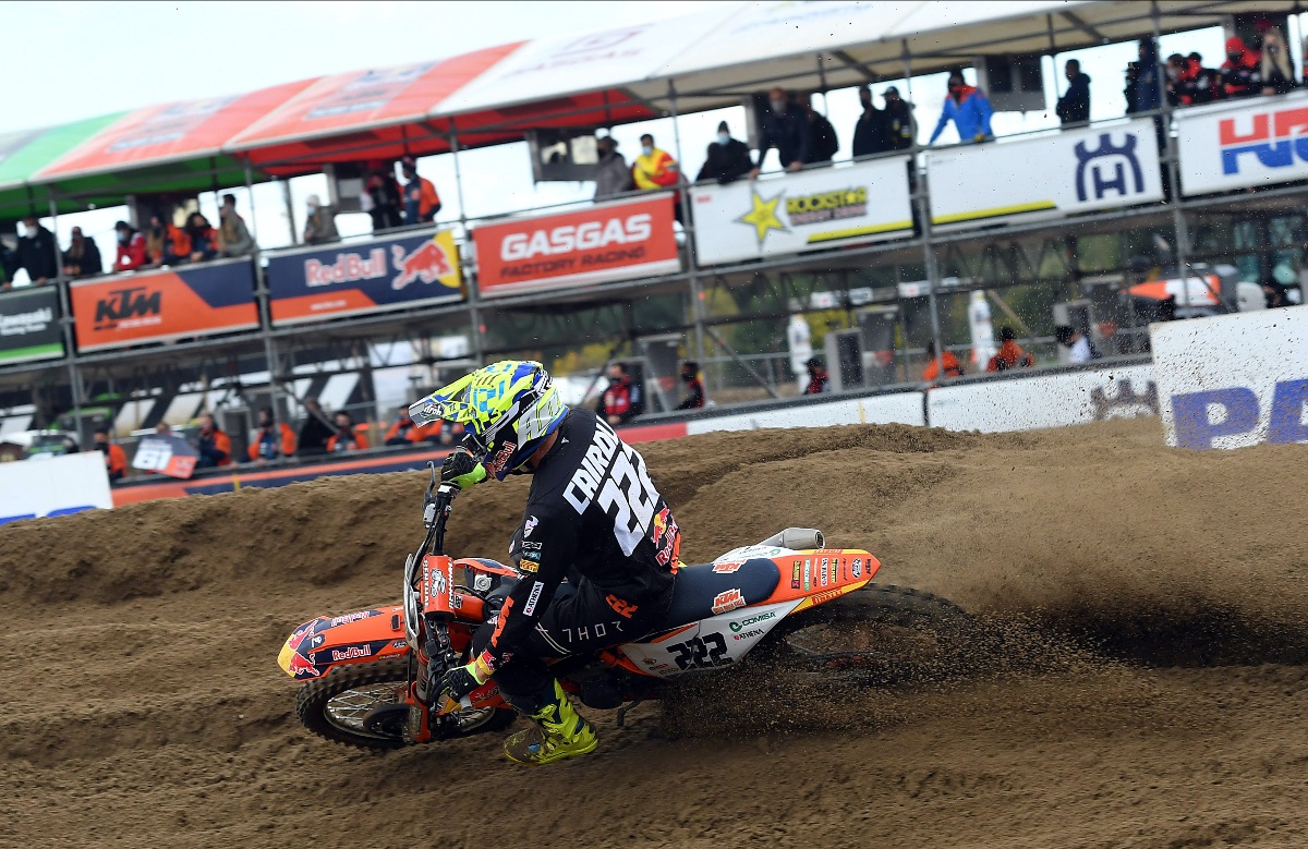 Con una grande gara ed il secondo posto di gara due, Tony Cairoli torna sul podio della MXGP, dimostrando di essere il combattente di sempre. Il Gran Premio del Limburgo, quattordicesimo round del Mondiale FIM di Motocross 2020, si è disputato sulla pista di Lommel dove, tre giorni dopo la precedente gara, si è tornati a correre sulla sabbia. Condizioni meteorologiche sensibilmente differenti per questo secondo round consecutivo sul tracciato sabbioso, con la pista bagnata dalle precipitazioni notturne ed un forte vento in aumento nelle ore centrali della giornata. Tony, determinato a lasciarsi alle spalle il brutto ricordo della precedente gara, ha iniziato la giornata facendo segnare il miglior tempo nella sessione di prove libere e successivamente l’ottavo in quella cronometrata, conquistando un buon cancello per le partenze del Gran Premio. Al via della prima manche Cairoli è rimasto chiuso all’esterno e non è riuscito a sfruttare il buono spunto al cancello della sua KTM 450SX-F, passando settimo sul traguardo del primo giro e trovandosi così impossibilitato a seguire il gruppo di testa. Il pilota del team KTM Red Bull Factory Racing ha guadagnato due posizioni nel corso della manche, chiudendo così quinto al termine di sedici giri. Scattato con i primi al secondo via, Tony ha trovato il giusto ritmo ed ha tallonato da subito i primi due, approfittando di un errore di Gajser che lo precedeva e piazzandosi alle spalle del compagno di squadra Jorge Prado. Il duello tra i due è stato spettacolare ed ha tenuto tutti col fiato sospeso fino alla fine della manche quando, a causa di un problema alla maschera, Cairoli ha dovuto rinunciare all’ennesimo affondo. Il secondo posto di gara due gli ha permesso comunque di conquistare il terzo posto di giornata ed il sesto podio stagionale, confermando il secondo posto in classifica di campionato. Tra quattro giorni si tornerà in pista con l’ultima delle tre gare sul tracciato di Lommel, il Gran Premio di Lommel.