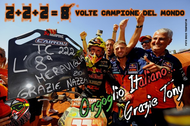 Tony Cairoli, il ragazzo siciliano, imbattuto dal 2009, che ha collezionato otto titoli di Campione del Mondo, sei conquistati di fila, nessuno come lui, nominato sportivo dell´anno da Sky, continua a essere poco considerato dagli organi di informazione italiani, che dedicano i loro spazi ai tornei regionali di calcio piuttosto che onorare le gesta di uno dei più grandi CAMPIONI della storia del motociclismo che sta scrivendo la sua leggenda.