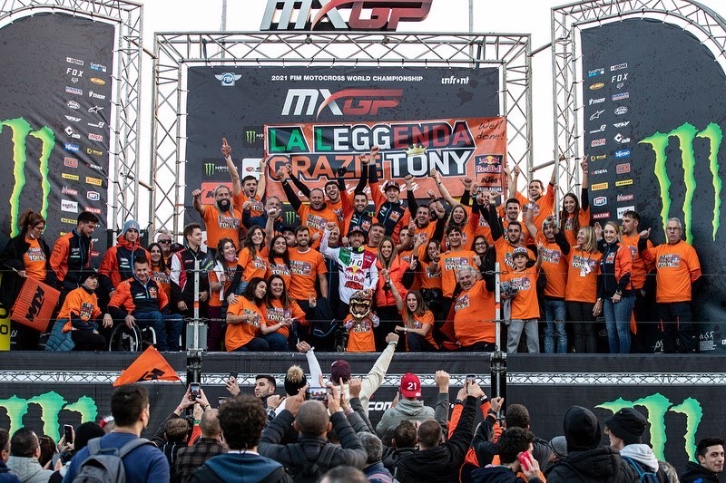 È stata lunga la strada che da Patti ti ha portato fino alla vetta del mondo. E’ stata una lunga strada quella percorsa per arrivare dalla dalla Sicilia a correre in tutto il mondo su decine di piste diverse. Hai trovato il successo in ogni paese e in ogni continente visitato, gareggiando al massimo livello per 18 anni, vincendo almeno una gara ogni anno. Nessuno mai ha fatto qualcosa di simile, nessuno è mai stato così competitivo per così tanto tempo nella sua carriera. 10708 punti, 278 GP, 552 partenze, 355 podi di manche, 182 vittorie di manche, 179 podi, 94 vittorie, 93 pole position, 9 titoli mondiali dei quali 6 consecutivi, un titolo al Motocross delle Nazioni con l’Italia, 3 titoli individuali al Nazioni. Sei l’unico che ha vinto il Mondiale con una 350 contro le 450, hai accettato sfide che nessuno si sarebbe sognato di fare, hai contribuito a fare di KTM il più grande costruttore di moto fuoristrada del mondo e hai portato la bandiera italiana in cima al podio in ogni paese che in cui hai corso. Sono numeri, certo, semplici numeri; i record sono fatti per essere battuti e tu lo sai bene avendone infranti decine ma ciò che durerà per sempre invece, sono tutte le incredibili emozioni che hai regalato in giro per il mondo. Tutti noi siamo grati e orgogliosi di aver fatto una parte di questo lungo cammino insieme a te, al tuo fianco. Era il momento della velocità e del fango ma ora è il momento della gloria. Non dimenticheremo mai quello che hai fatto per lo sport, per la squadra, per tutti noi. Grazie Tony.