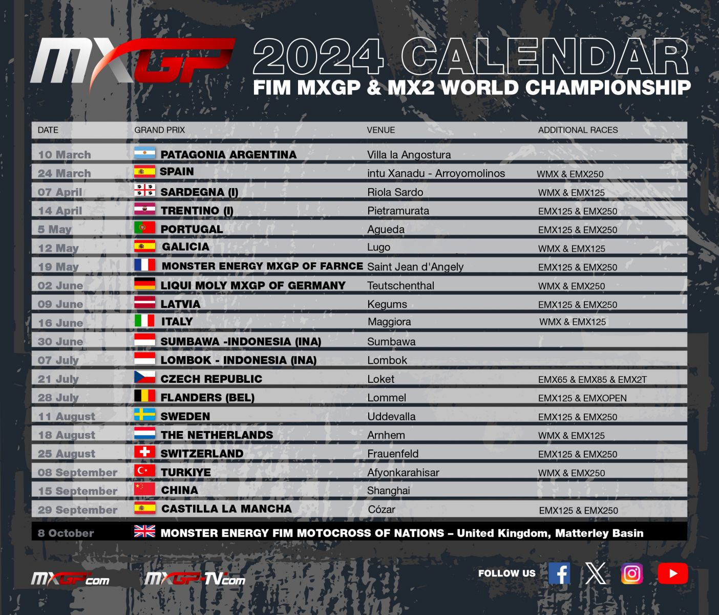 Nello stesso comunicato si conferma che il Motocross of European Nations (MXoEN), che si terrà al TCS Racing Park vicino alla capitale rumena Bucarest, sarà spostato al 22 settembre 2024. MXoEN e WMXoEN si correranno nella stessa location nel medesimo weekend.