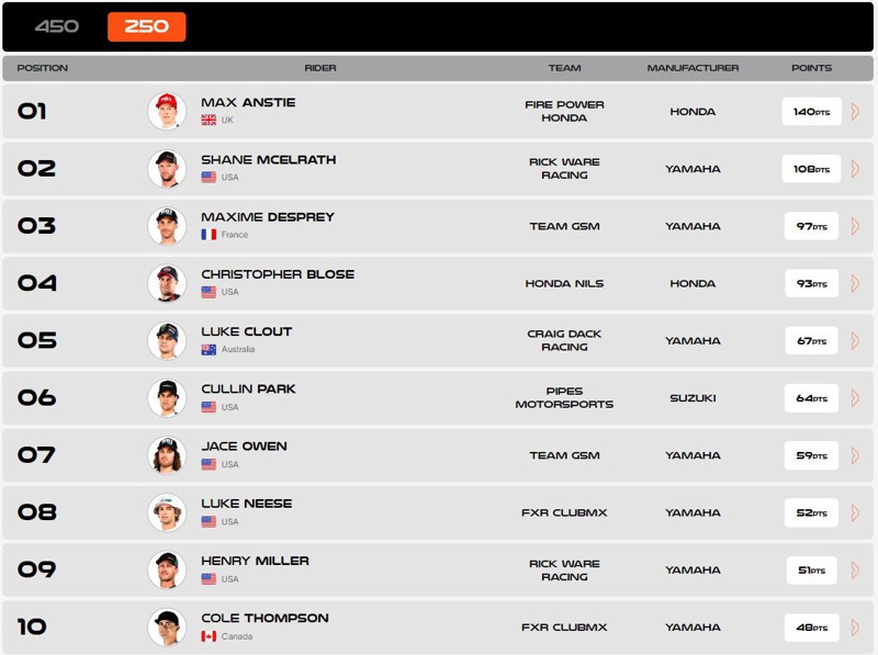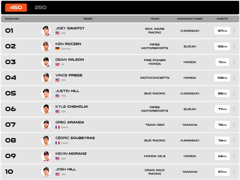 Per la cronaca al comando della 250 c’è Max Anstie con un buon vantaggio su Shane McElrath, in 450 Joey Savadgy conta 5 punti di vantaggio su Ken Roczen, con il tedesco che ha patito in particolar modo il tracciato della Etihad Arean che addirittura lo metteva in seconda fila al cancello di partenza.