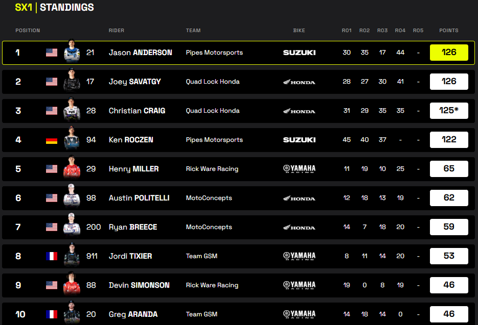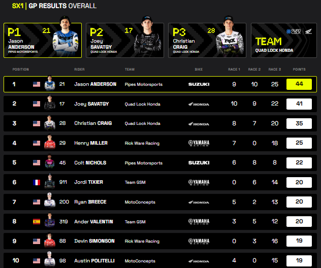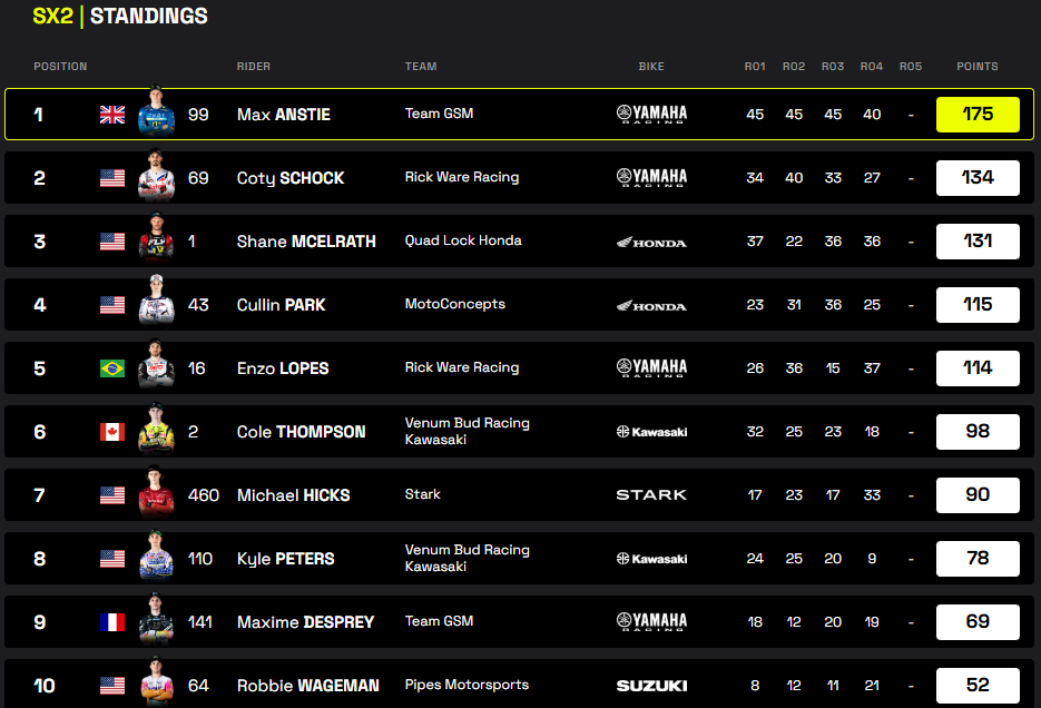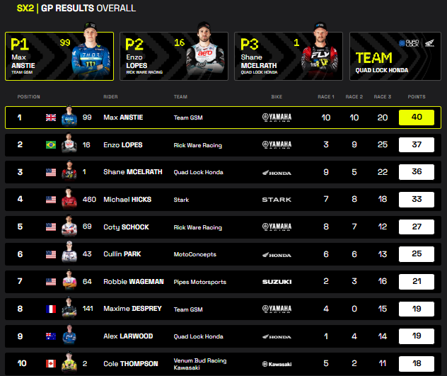 Con Roczen assente come da programma (non sarà dietro al cancello nemmeno alla prova conclusiva in Sudafrica), vince Jason Anderson che balza in testa alla classifica. In 250 Max Anstie vince due gare su tre, lasciando l’ultima a Enzo Lopes.